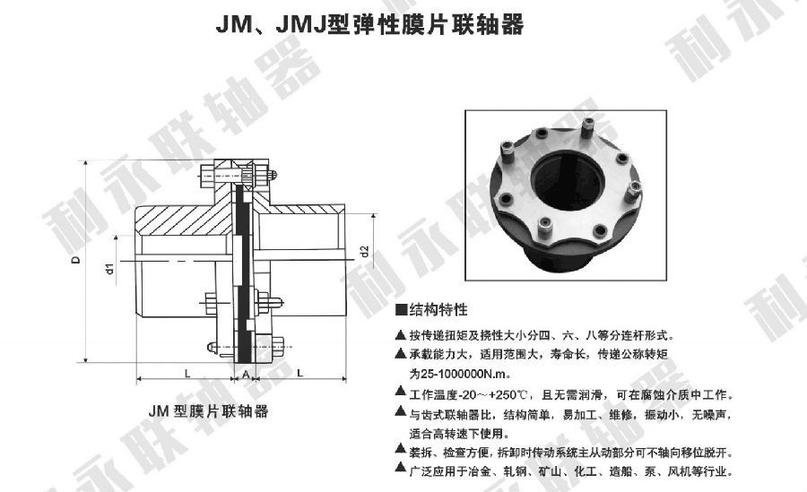 JM型膜片聯(lián)軸器是 具代表性的金屬擾性聯(lián)軸器,它在各種機(jī)械設(shè)備上都可以采用。其膜片采用0.3~2mm厚的 高強(qiáng)度不透鋼薄板鉚制成組件,上面有4~16個(gè)鉸制孔,用螺拴分別與主、從動(dòng)法蘭聯(lián)結(jié)。運(yùn)行中膜片受拉、壓、扭應(yīng)力。這種聯(lián)軸器制造成本低,傳遞扭矩范圍大,力學(xué)性能好,裝拆方便,對(duì)安裝精度要求不高,它集中體現(xiàn)了擾性聯(lián)軸器的優(yōu)點(diǎn),可廣泛應(yīng)用于各種領(lǐng)域,適應(yīng)多種工況條件,例如泵、風(fēng)機(jī)、軋機(jī)、造紙機(jī)械、電力機(jī)械、水泥機(jī)械、船舶工業(yè)、航空航天等。由于其減振性能好、傳動(dòng)平穩(wěn),在各種行業(yè)的應(yīng)用中, 普通的贊同和采用,尤其是在造紙行業(yè)中,它能使您生產(chǎn)出的紙張 加平整、光滑、質(zhì)量大幅度提高,使您能夠始終 一步,同時(shí)也是發(fā)電廠、石化廠、水泥廠、軋鋼廠、礦山等進(jìn)行技術(shù)改造、替代進(jìn)口、節(jié)能降耗的 佳選擇。